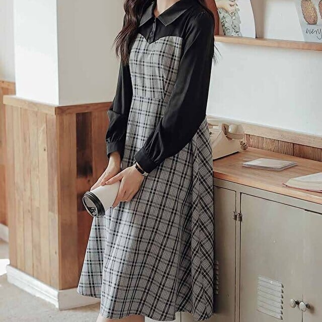 ワンピース 長袖 膝丈 フレア 重ね着風 チェック柄 襟付き 大人カジュアル デート お出かけ