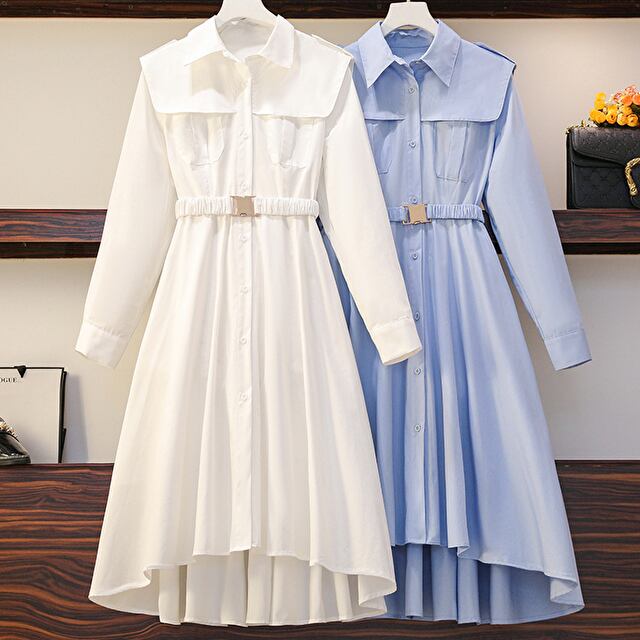 ワンピース シャツワンピース 長袖 膝丈 シンプル 無地 大人カジュアル ウエストベルト デート