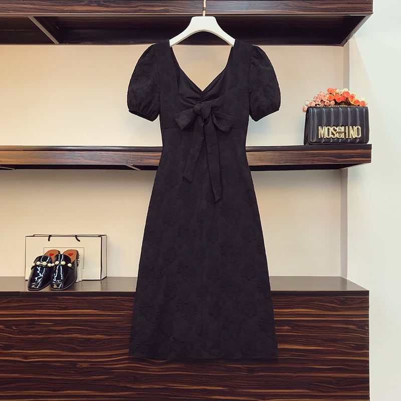 ワンピース 半袖 フレア 膝丈 ミモレ丈 パフスリーブ Vネック シンプル 無地 きれいめ 上品
