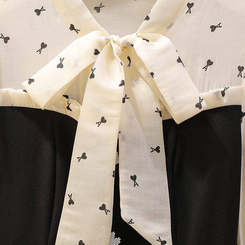ワンピース 長袖 膝丈 ハート柄 リボン 切り替えデザイン 大人可愛い デート お出かけ