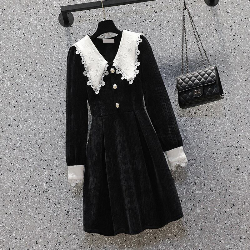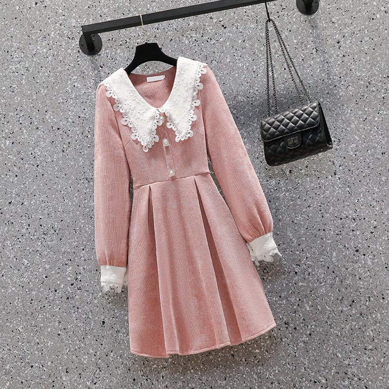 大人可愛いレース襟デザインの膝丈ワンピースです。