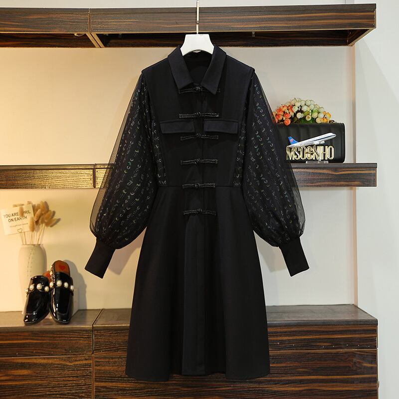 ワンピース 長袖 膝丈 バルーンスリーブ チュール シンプル 無地 大人可愛い デート お出かけ