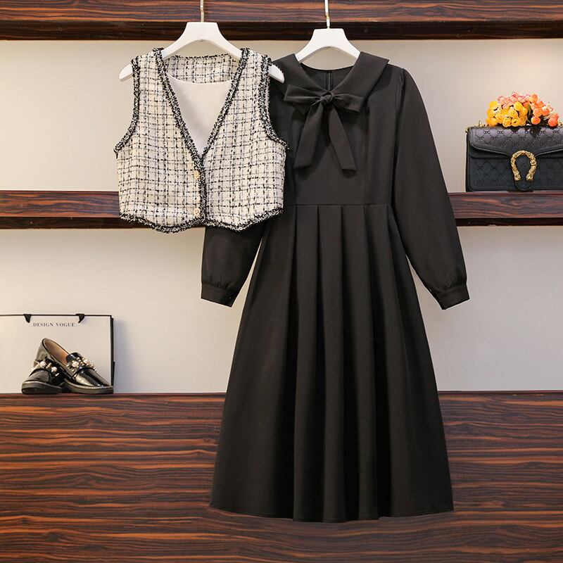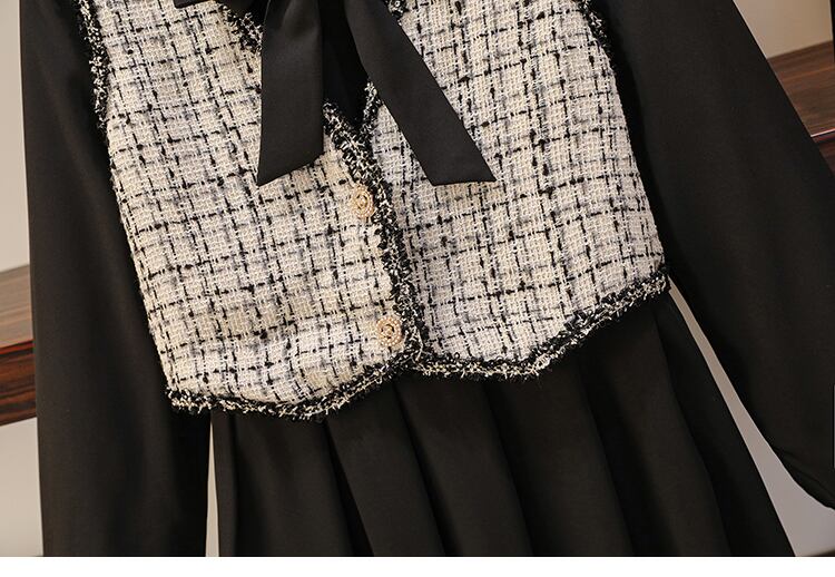 ツイード素材のベスト付きの膝丈ワンピースです。