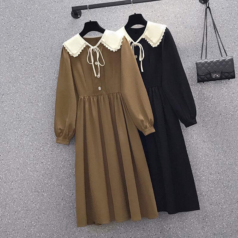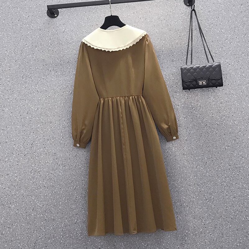 ワンピース 長袖 膝丈 フレア ビックカラー くびれデザイン パフスリーブ シンプル 無地 大人可愛い