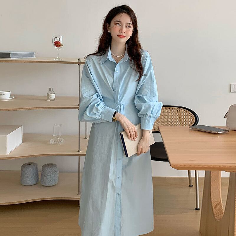 ワンピース シャツワンピース 長袖 ミモレ丈 シンプル 無地 大人カジュアル ゆったり 春