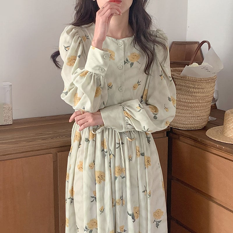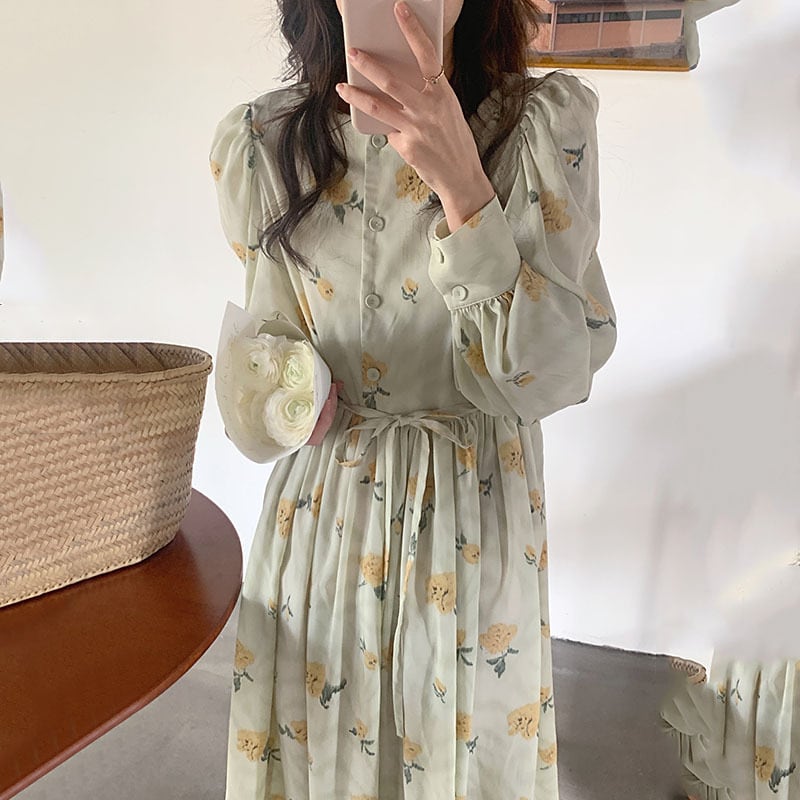 ワンピースシフォンワンピース 長袖 ミモレ丈 小花柄 ウエストリボン 大人可愛い デート お出かけ