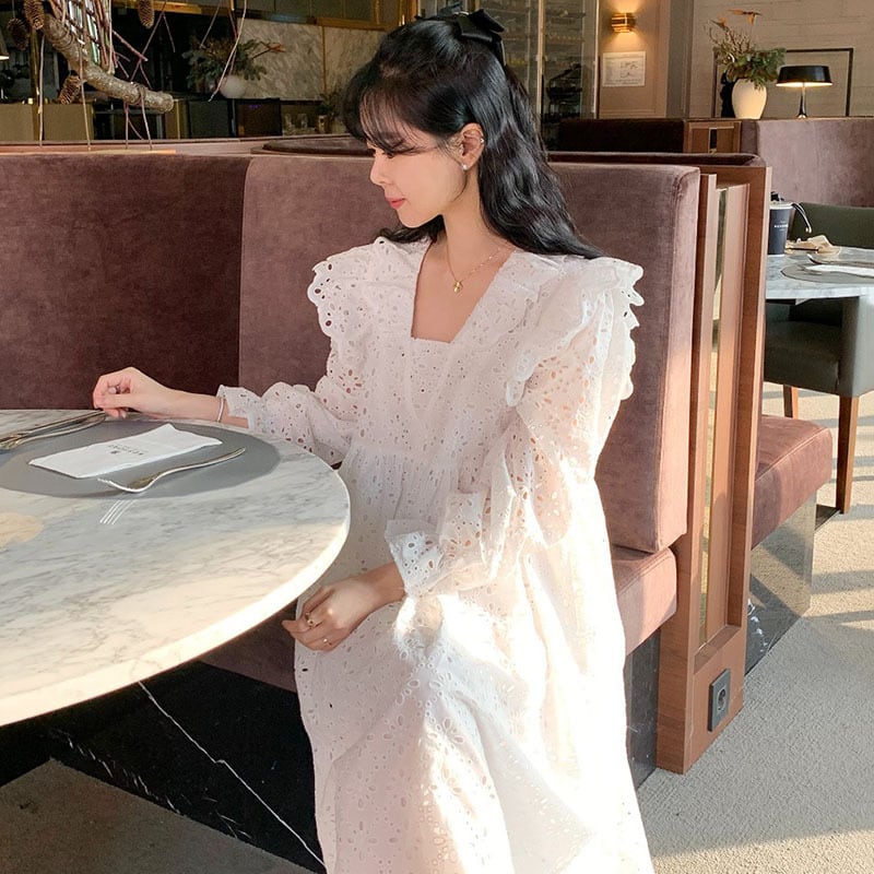 ワンピース 長袖 ミモレ丈 コットンレース フリル シンプル 無地 大人可愛い デート お出かけ