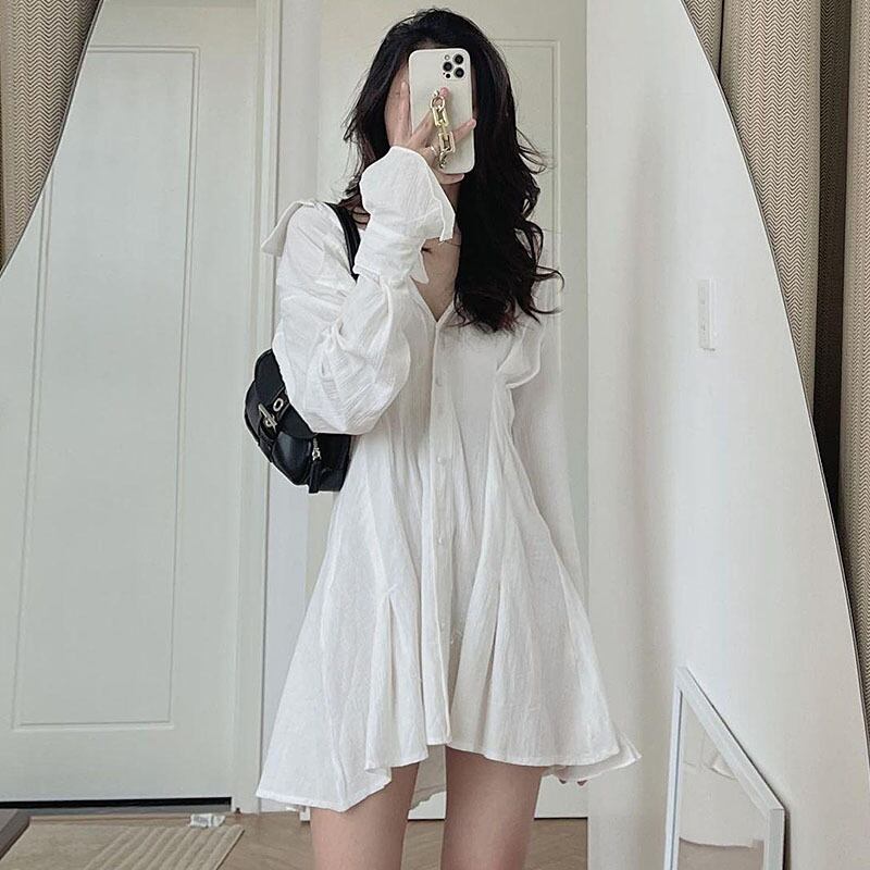 ワンピース シャツワンピース 長袖 膝丈 フレア シンプル 無地 大人カジュアル デート お出かけ