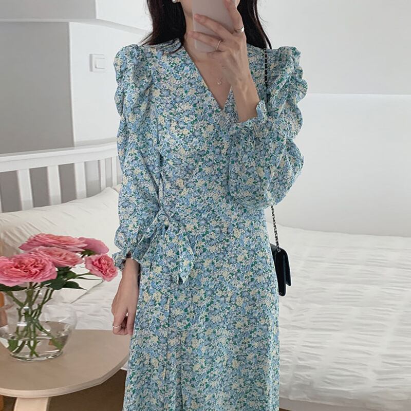 ワンピース シフォンワンピース 長袖 ミモレ丈 小花柄 カシュクール フリル 大人可愛い デート 春