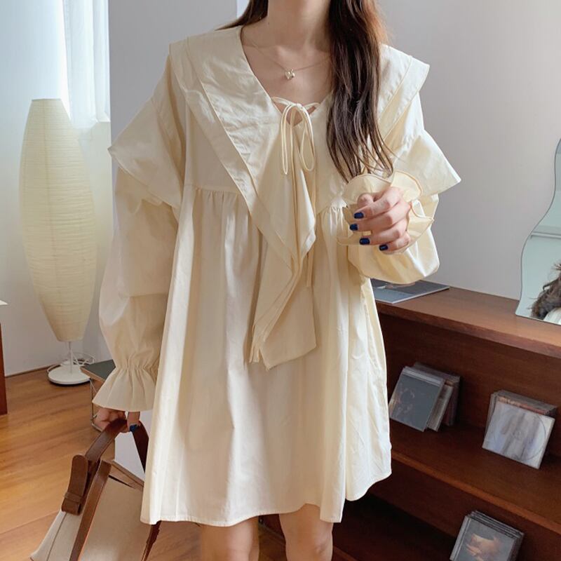 ワンピース チュニック 長袖 ミニ丈 フレア ビックカラー フリル シンプル 無地 大人可愛い デート