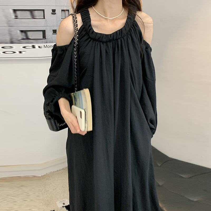 ワンピース 長袖 ミモレ丈 肩出しデザイン オープンショルダー シンプル 無地 大人カジュアル ゆったり