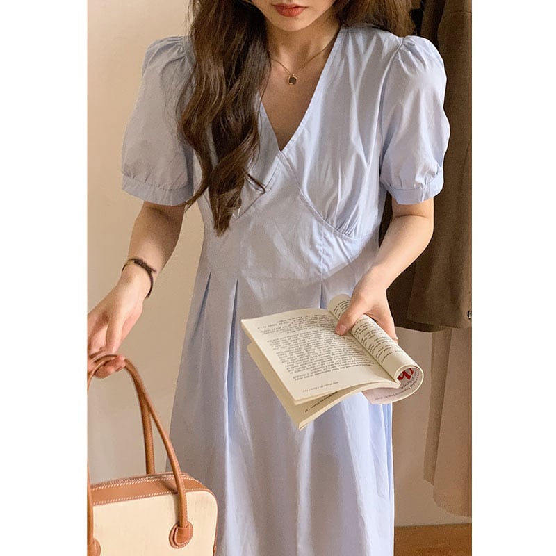 ワンピース 半袖 膝丈 フレア パフスリーブ Vネック シンプル 無地 きれいめ 大人カジュアル
