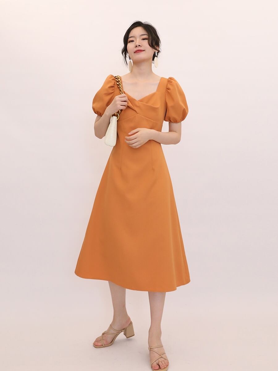 ワンピース 半袖 ミモレ丈 フレア パフスリーブ くびれデザイン シンプル 無地 きれいめ 大人可愛い