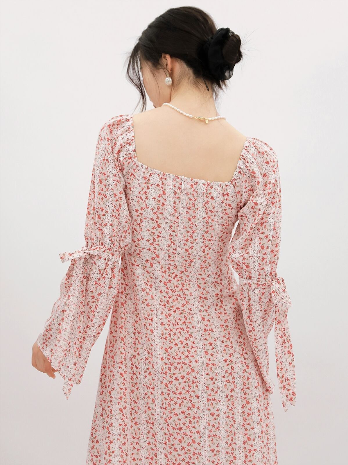 ワンピース 長袖 Aライン スクエア襟 ホワイト 花柄 スリム 薄手