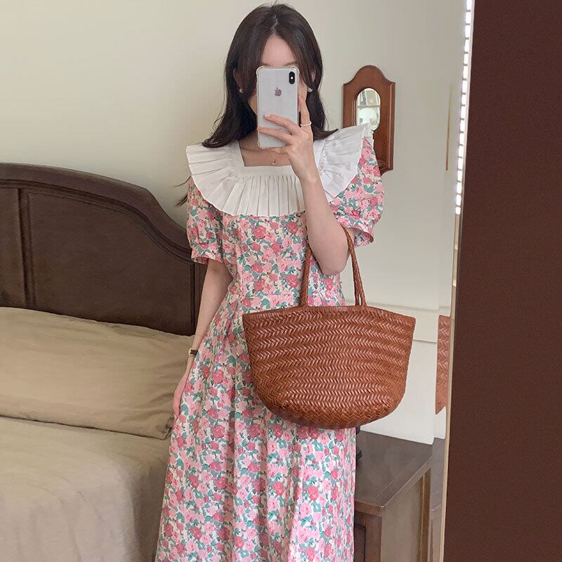 ワンピース 半袖 ミモレ丈 小花柄 ビックカラー プリーツカラー ゆったり デート お出かけ