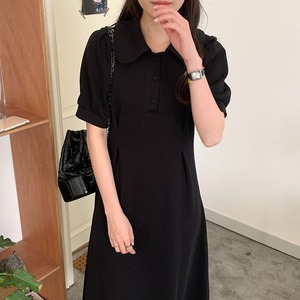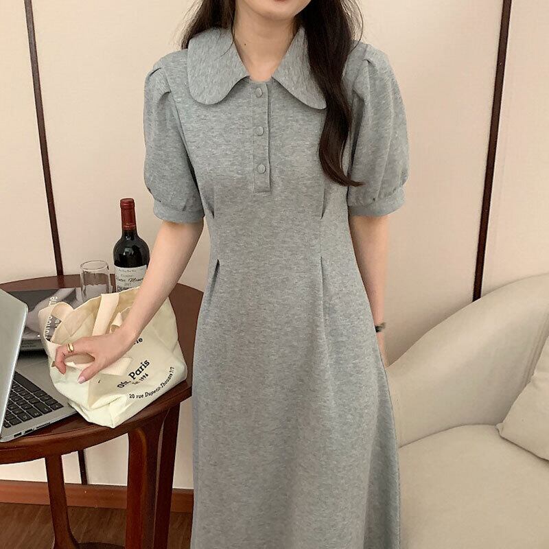 ワンピース 半袖 ミモレ丈 パフスリーブ シンプル 無地 大人カジュアル 襟付き お出かけ 夏