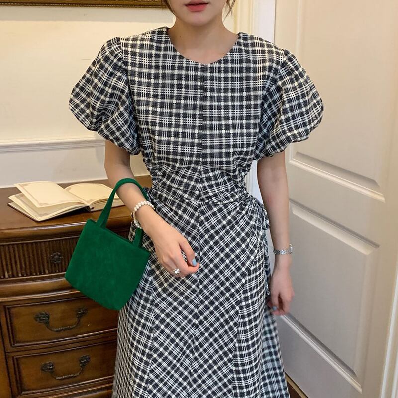 ワンピース 半袖 膝丈 パフスリーブ くびれデザイン チェック柄 サイドオープン 大人カジュアル