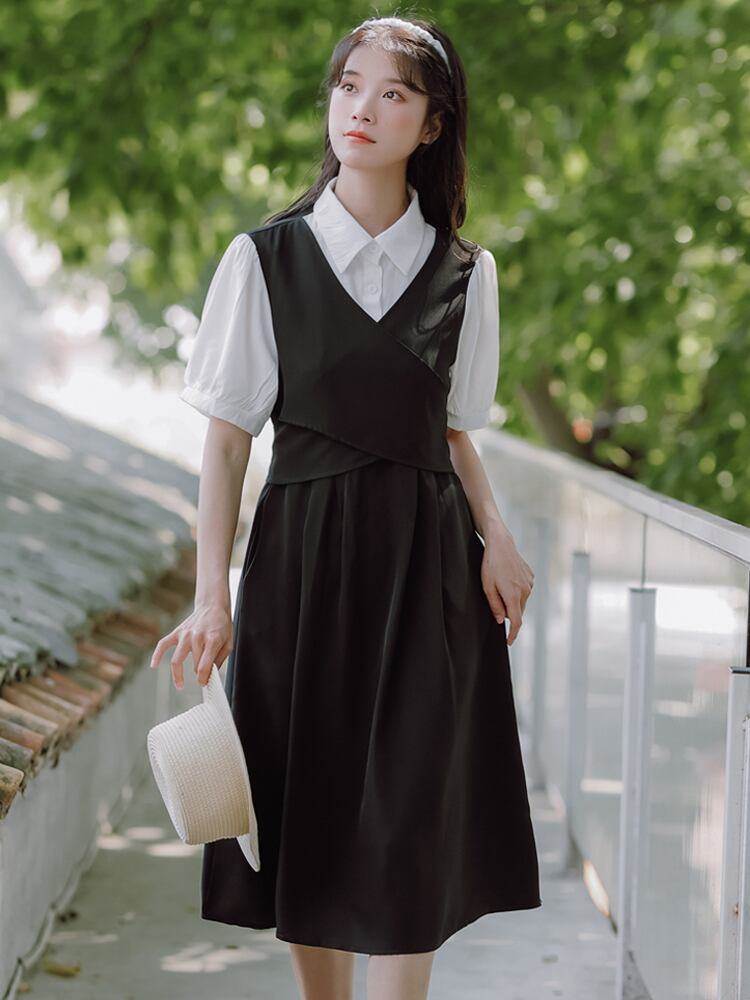 ワンピース 半袖 膝丈 フレア 重ね着風 襟付き シンプル 無地 大人カジュアル デート お出かけ