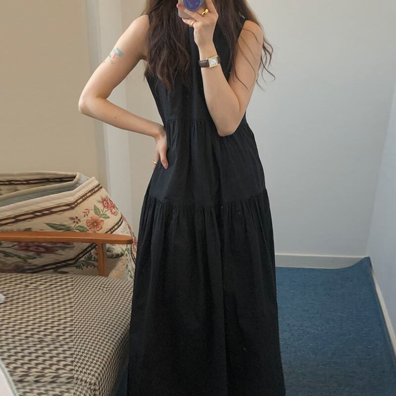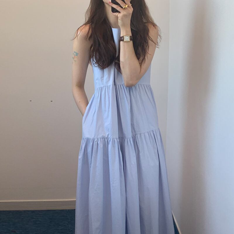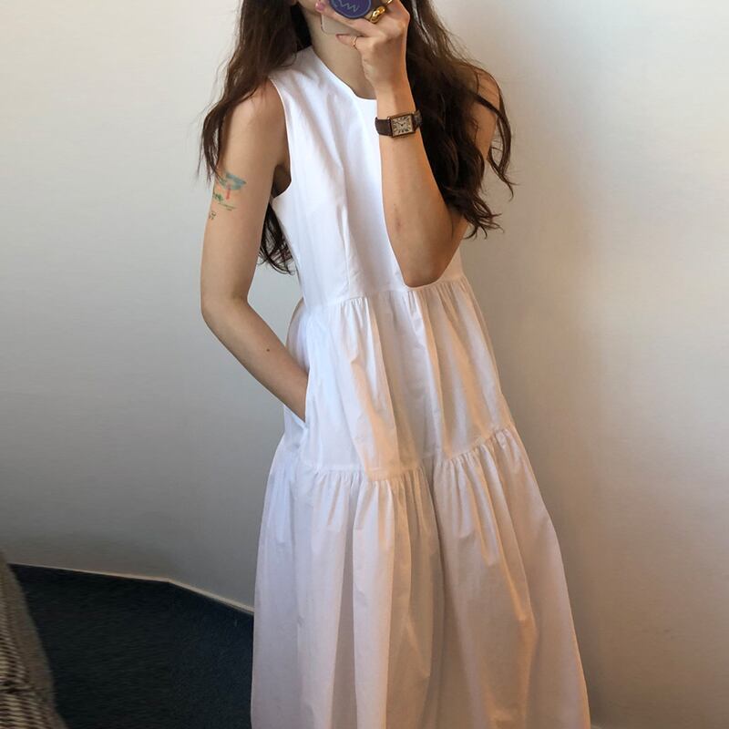 ワンピース ノースリーブ ミモレ丈 ロング丈 フレア コットン シンプル 無地 大人カジュアル 夏