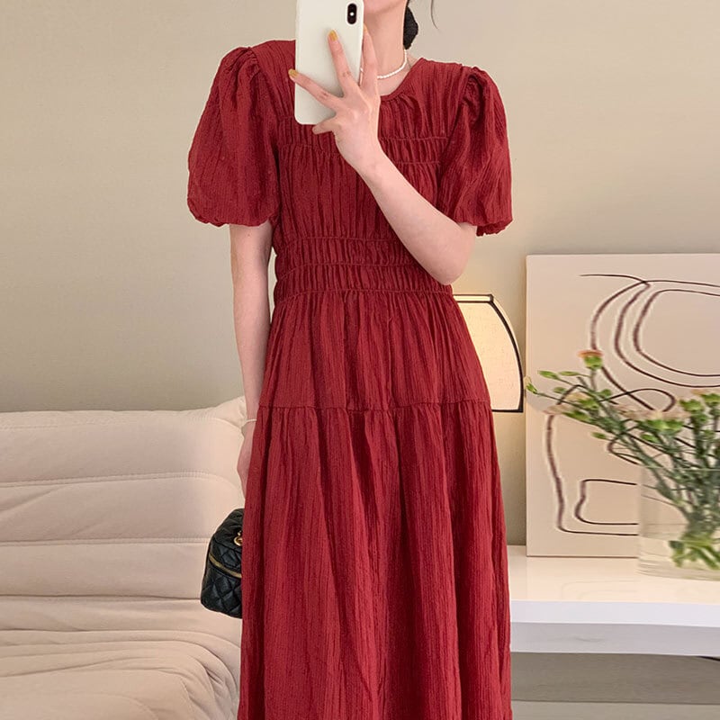 ワンピース 半袖 ミモレ丈 フレア くびれデザイン フロントギャザー シンプル 無地 大人カジュアル