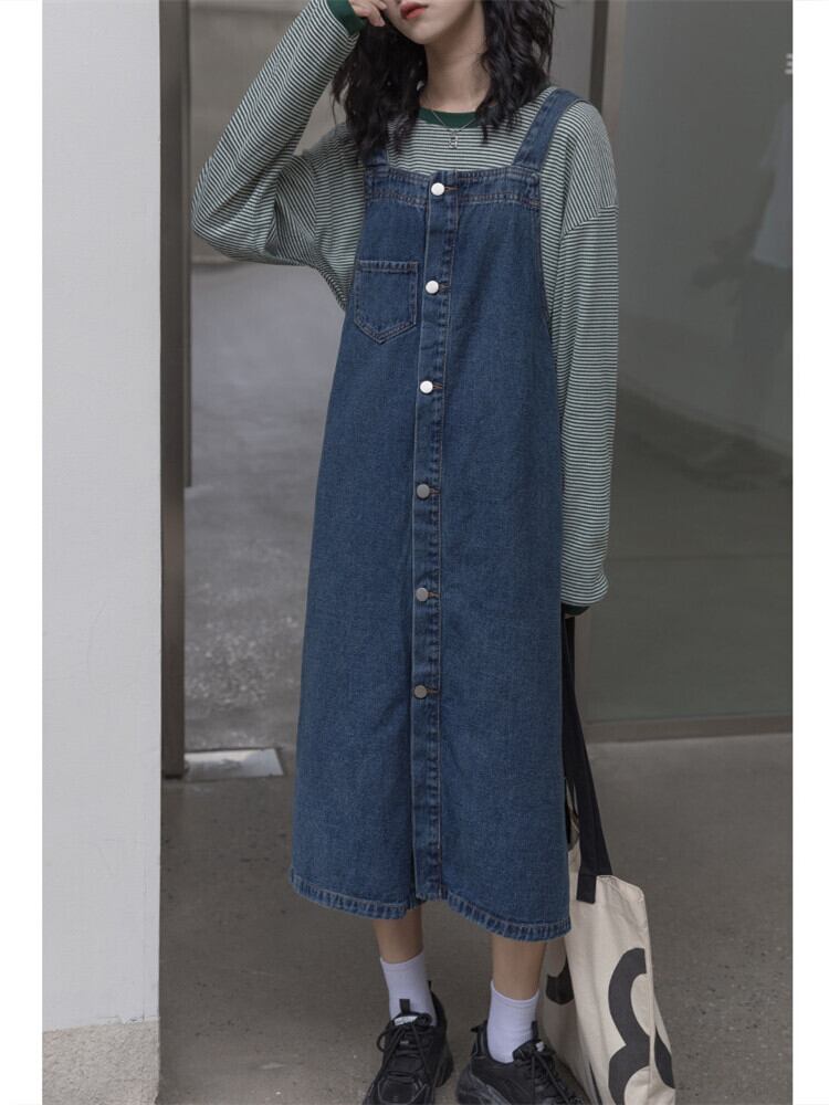 ワンピース ジャンパースカート デニムワンピース ノースリーブ フロントボタン ミモレ丈 カジュアル