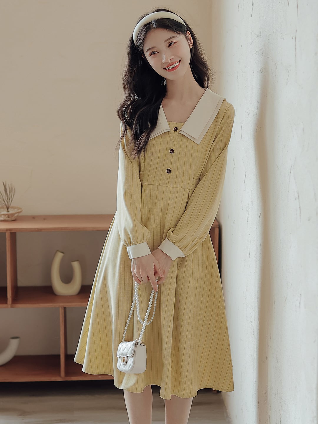 ワンピース 長袖 ミドル丈 きれいめ ストライプ レトロ おしゃれ